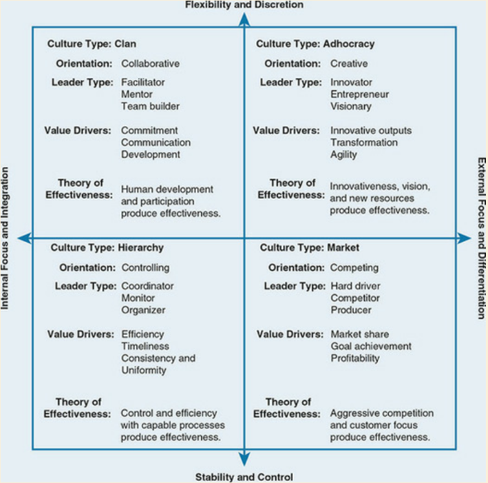 Competing Values Framework is a great analysis tool for quantitative data surrounding the culture of an organization (Anderson, 2019). In this framework, individuals complete a survey that rates the organization on two axes of “internal versus external focus and preferences for flexibility or control” (Anderson, 2019, p. 343. These ratings can be plotted on the axes as seen in Figure 1, below. Each resultant quadrant has specific attributes as seen in Figure 2, below.